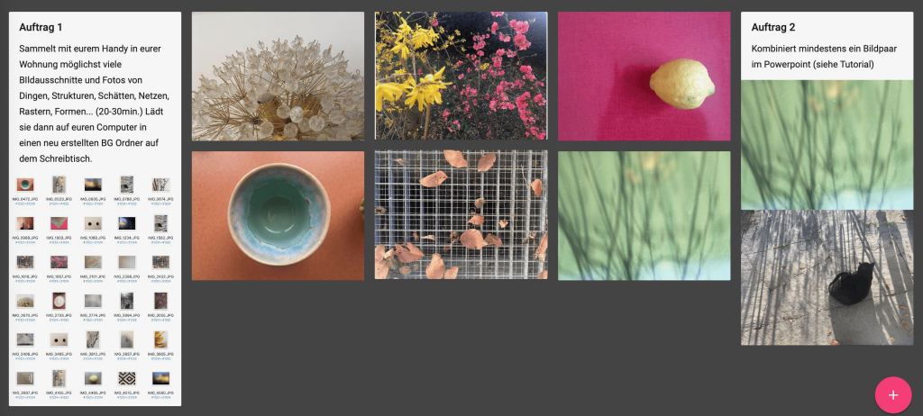 Die Schüler*innen sammelten mit den Handys möglichst viele Bildausschnitte von Dingen, Strukturen, Schatten, Netzen, Rastern und Formen in ihren Wohnung. Im Programm Powerpoint kombinierten sie die Bilder anschliessend zu Bildpaaren.