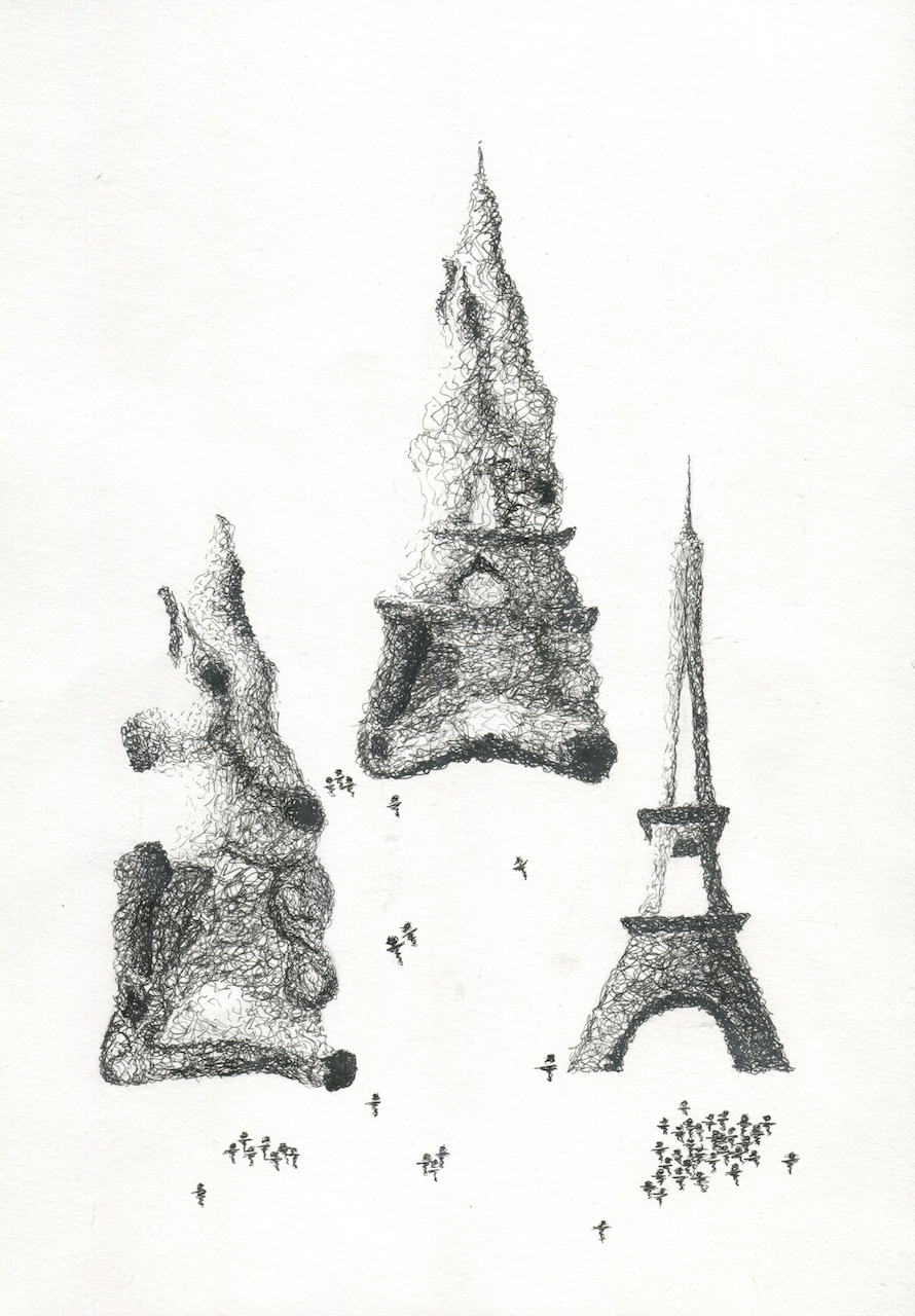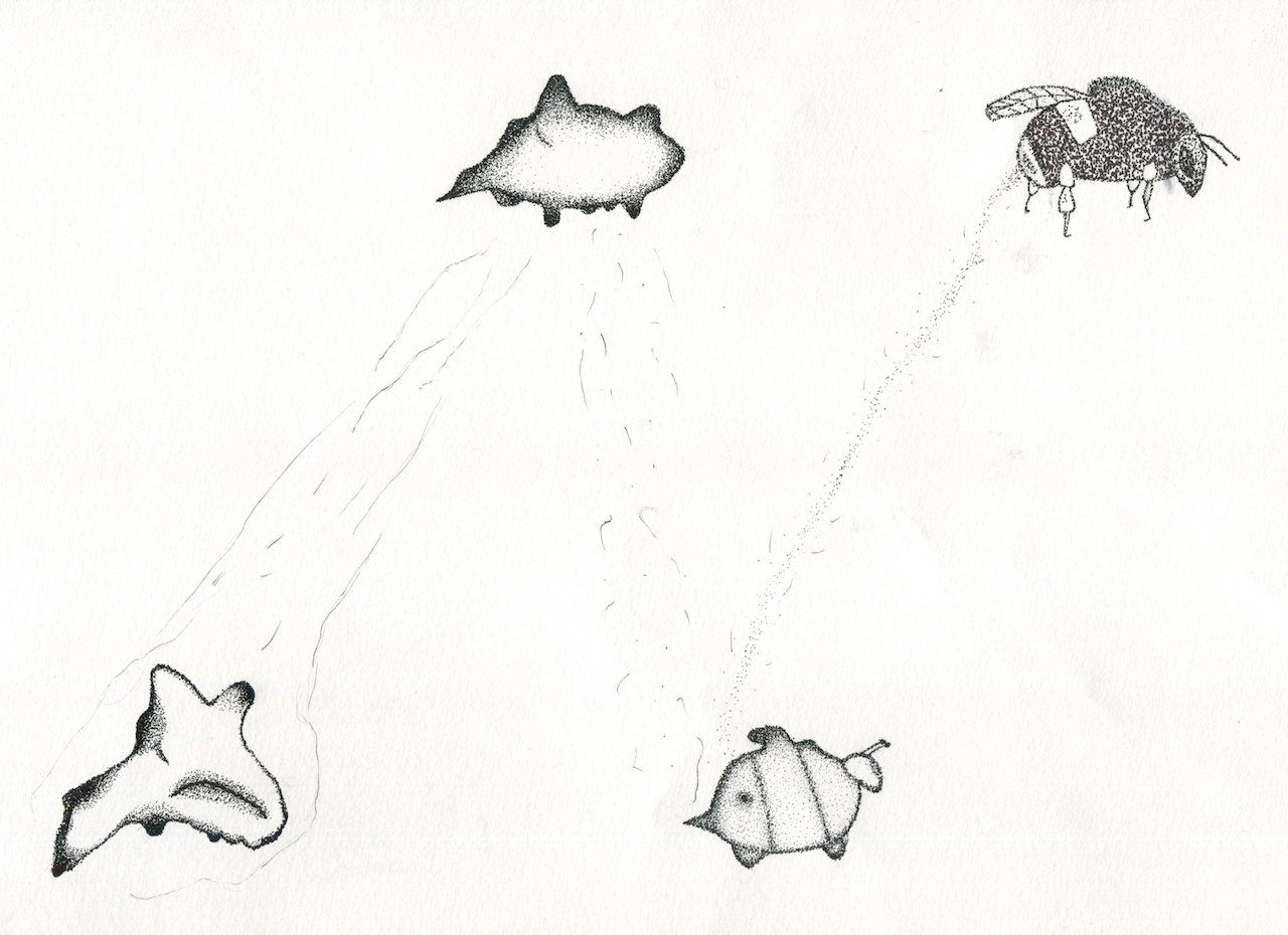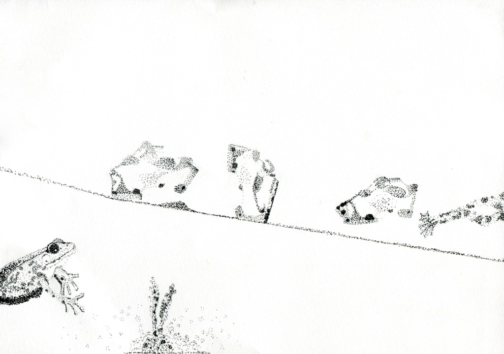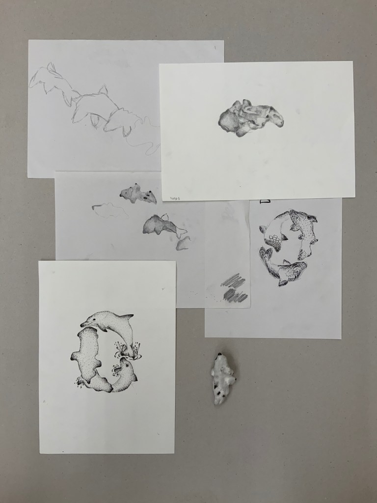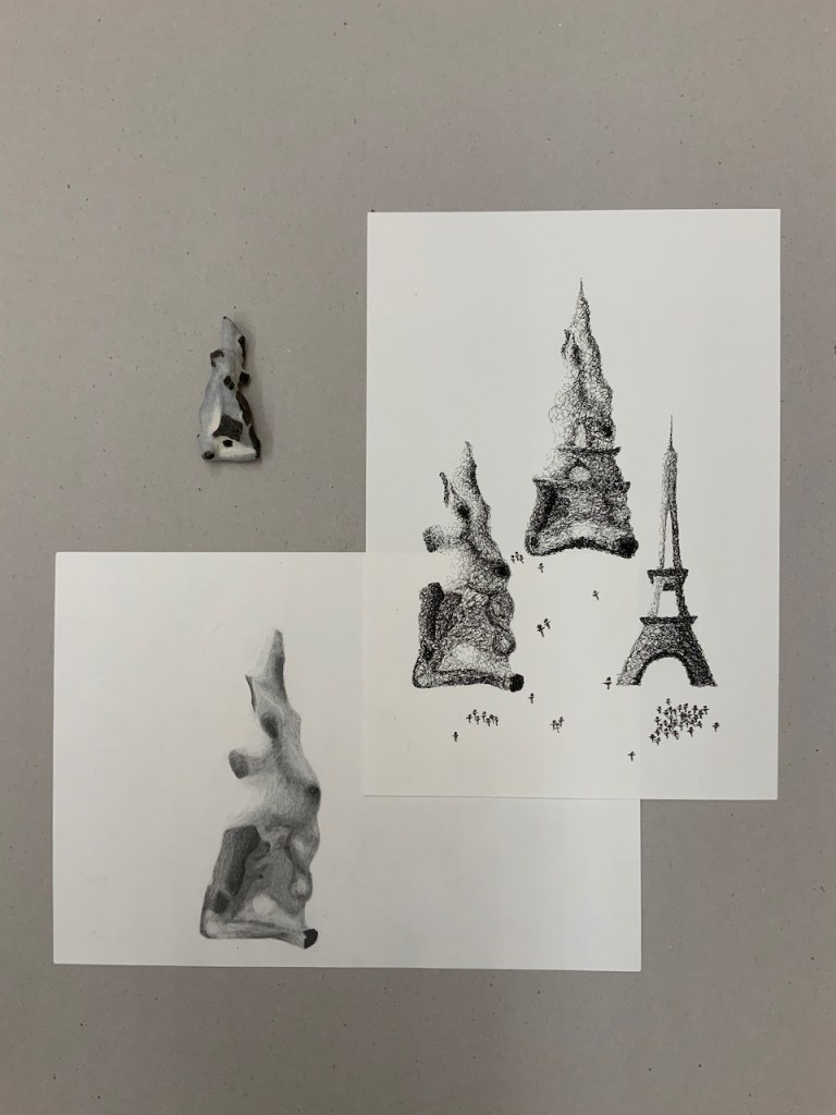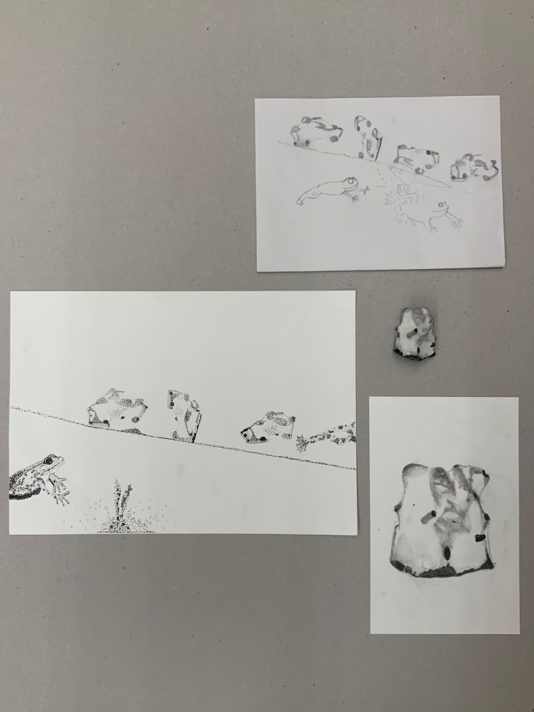 Die Schüler*innen der Klasse 3c entwickelten, ausgehend von einem ausgewählten Stein, eine Metamorphose. Sie suchten darin nach Wesen, Objekten und Gebäuden und setzten diese Verwandlung zeichnerisch mit Fineliner um.