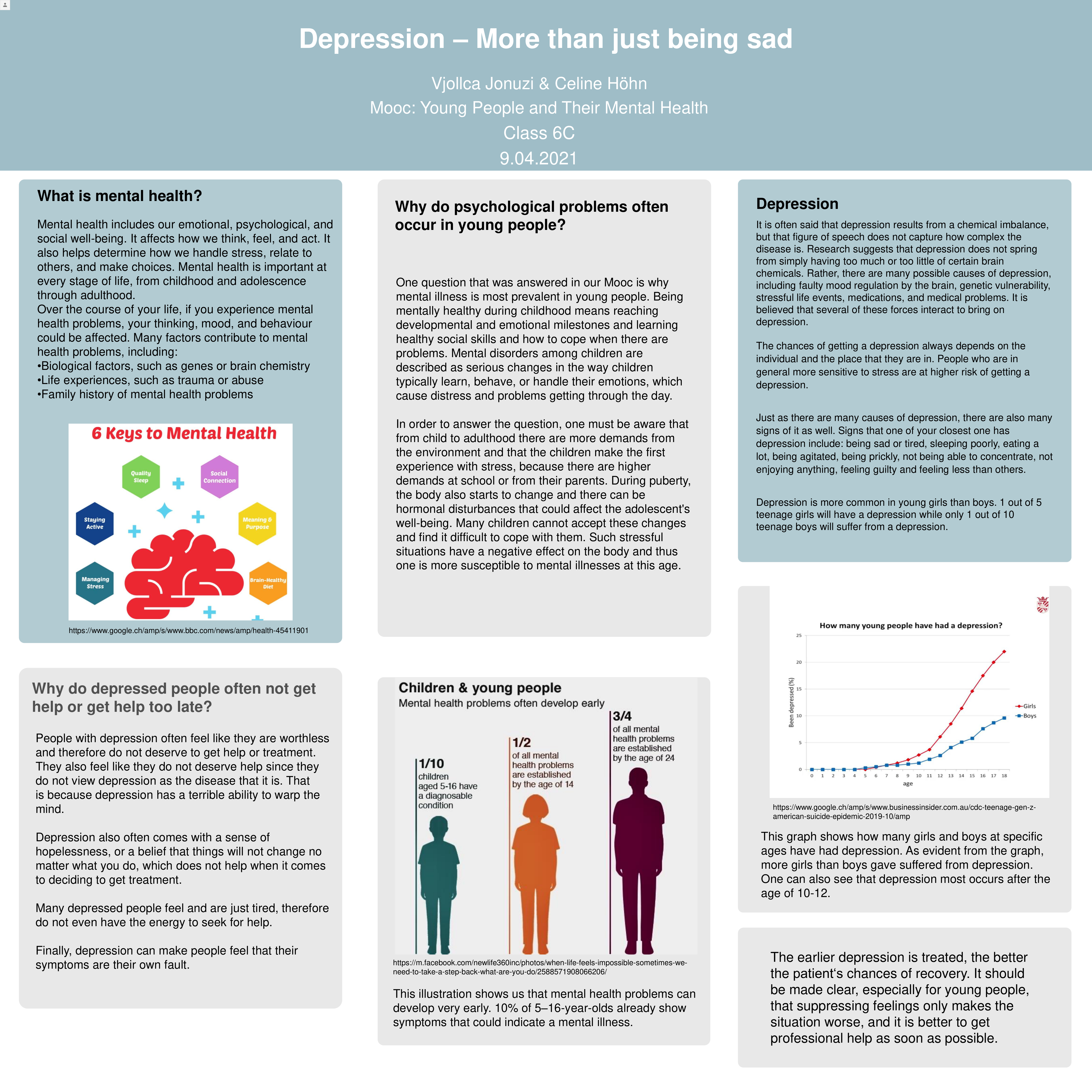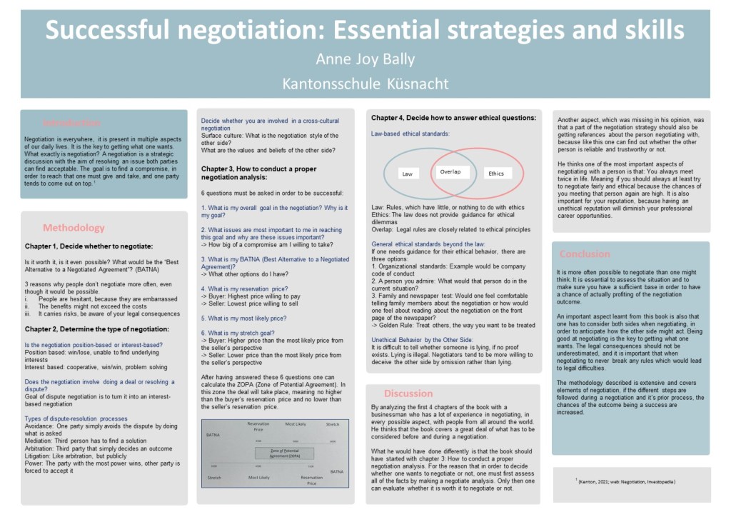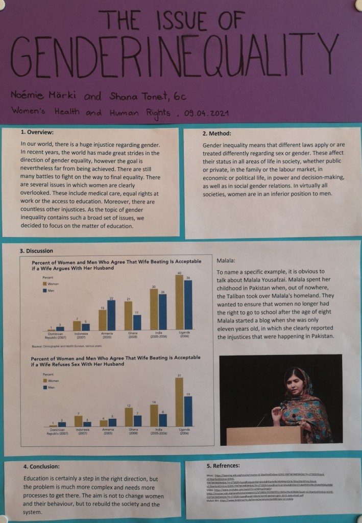 Over the last few weeks, every student had the possibility to immerse themselves in a subject of their choosing. This project was based on free online courses provided by different universities, from which we could each select one that we were passionate about. These courses are combined in the term MOOC (Massive Open Online Courses) and are used by millions of people around the world to learn about subjects ranging from business courses to language studies and many more. Just as diverse were the topics chosen by our class. After choosing a course we spent several of our lessons studying our topic individually and taking notes in order to eventually present it to our classmates. Examples of the end products of this project can be viewed on this page in form of academically structured scientific posters, that give the reader an insight into what the individual students learned throughout the past weeks. (Michelle Gasser, 6c)