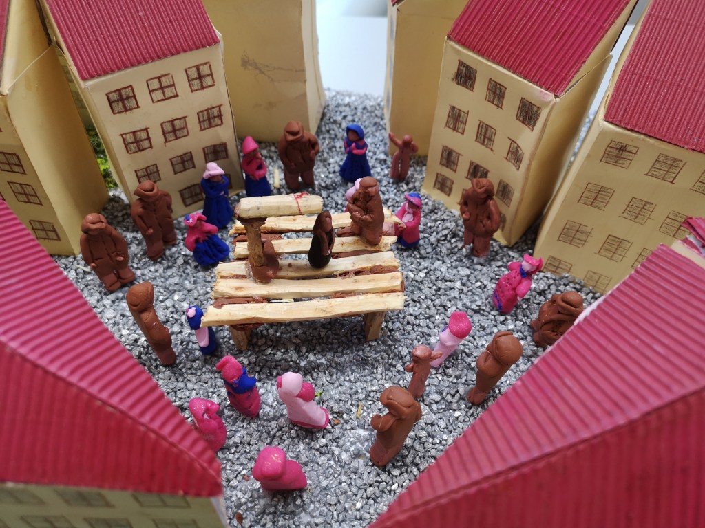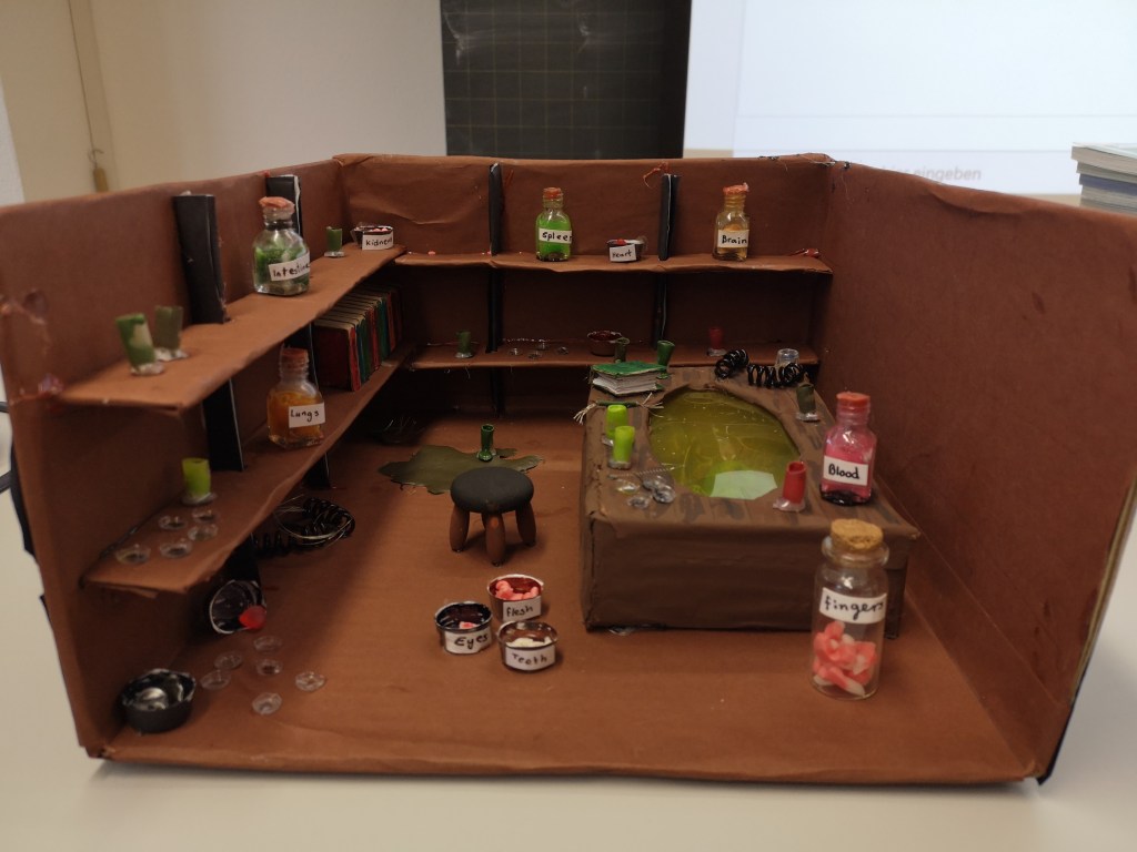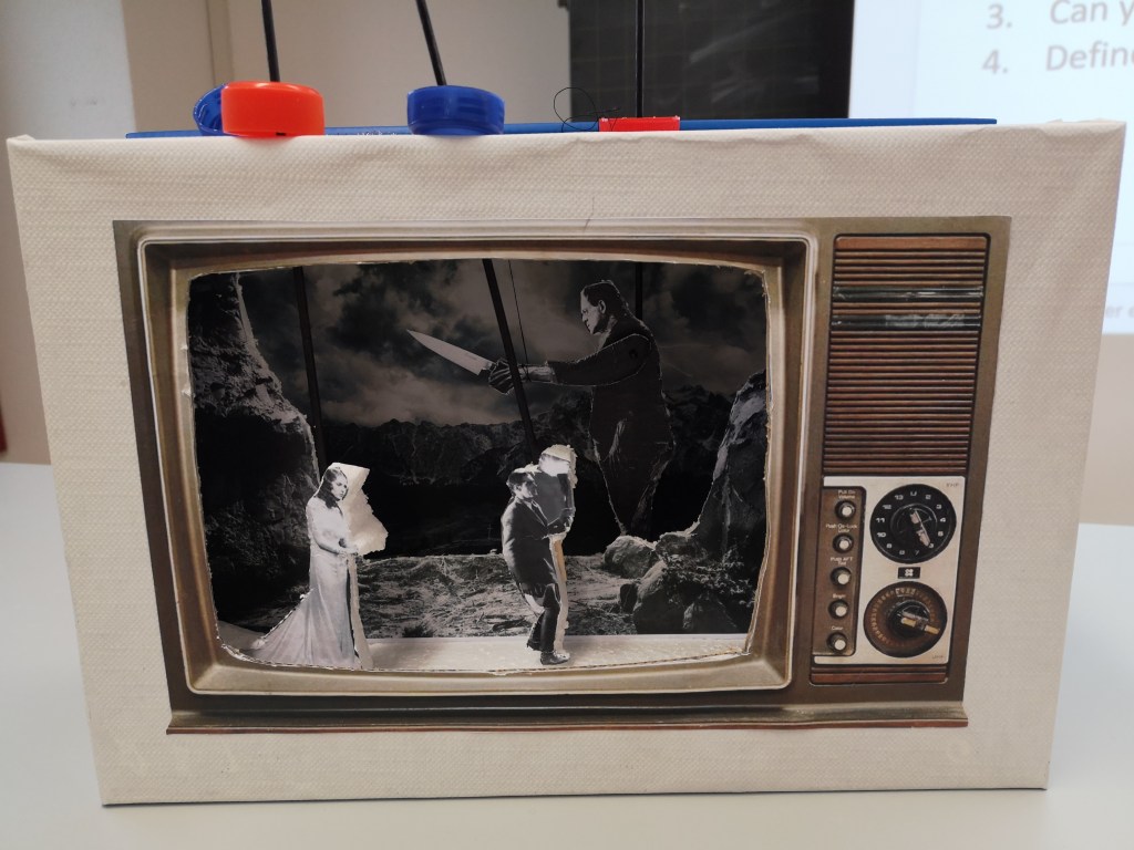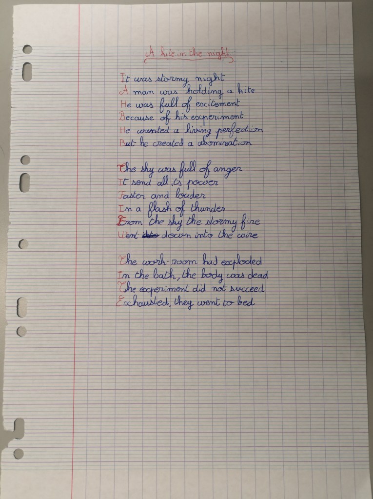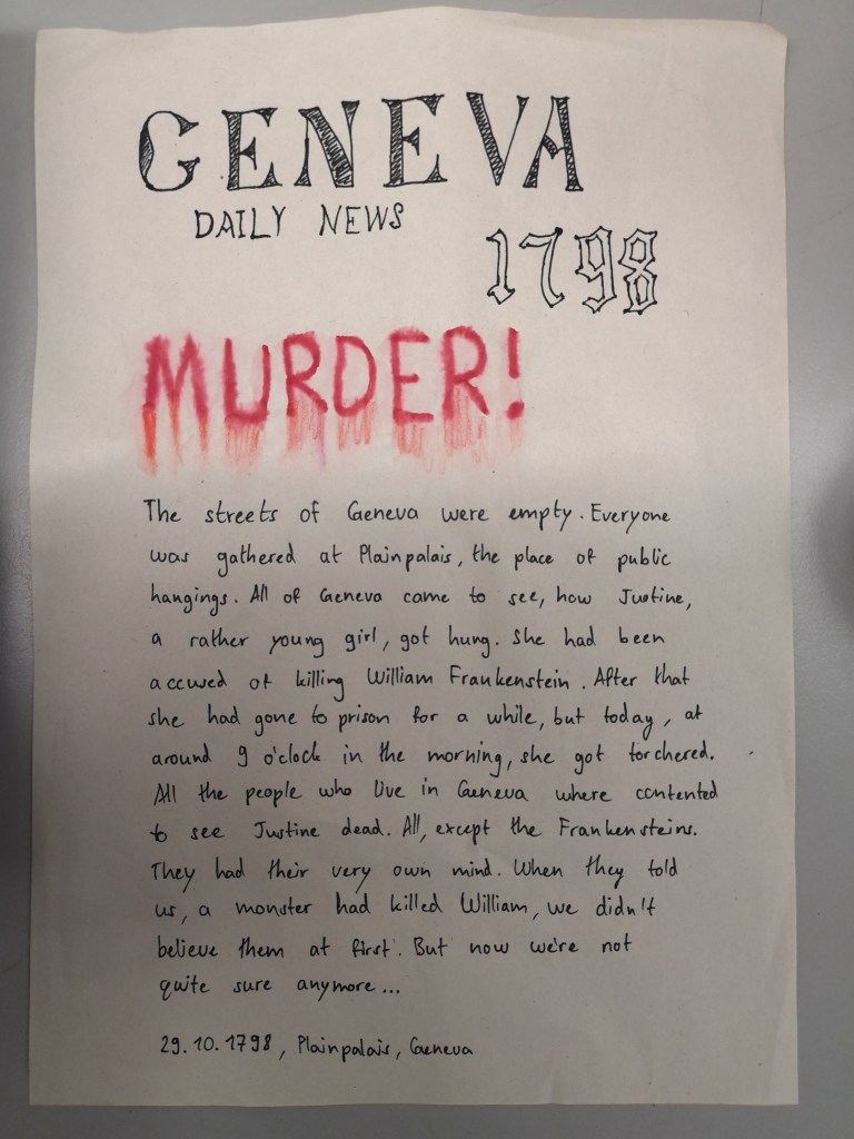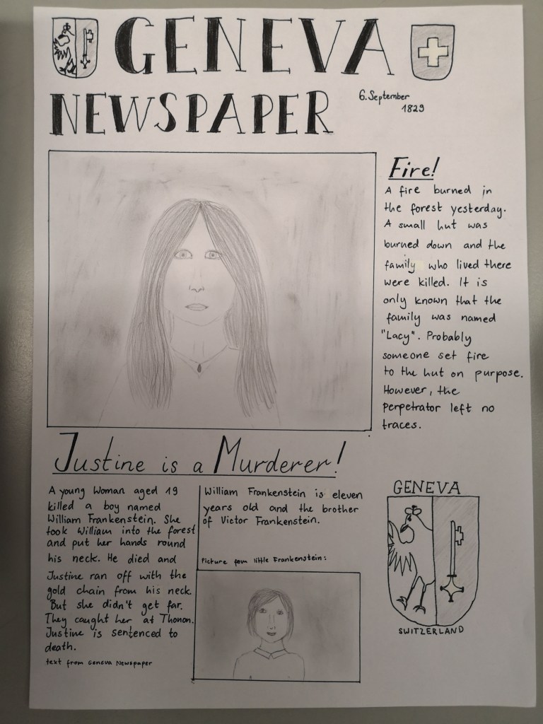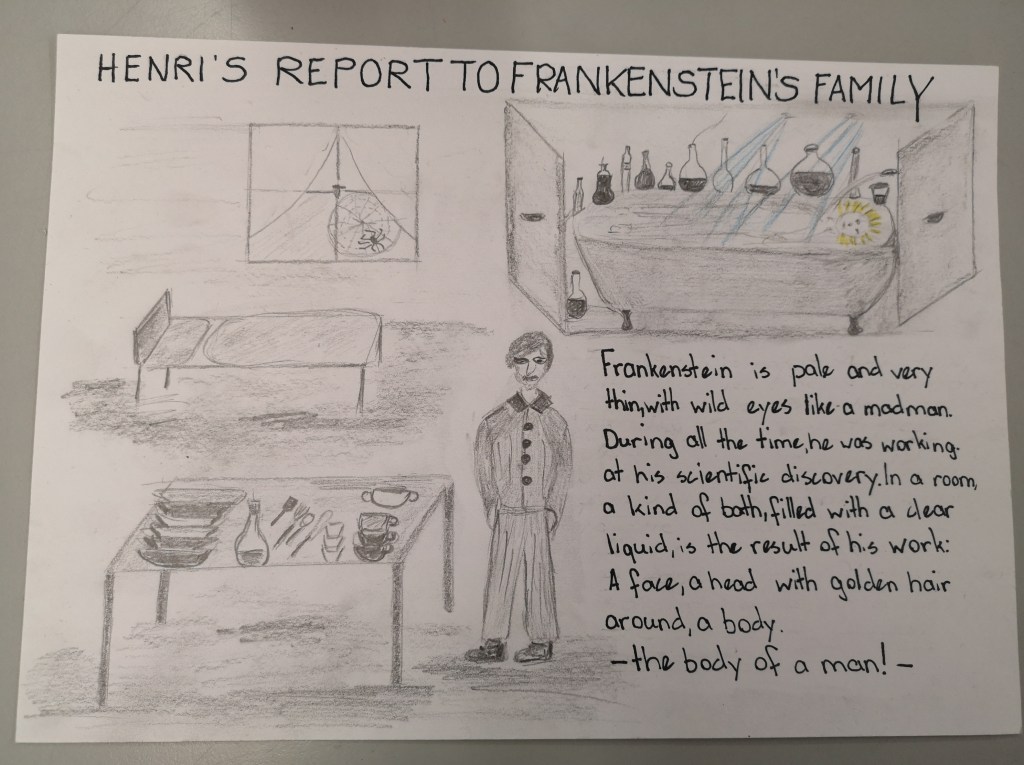 In our English lesson we read about Frankenstein and his monster. After reading the story, we had to design a creation showing our favourite scene. Some students wrote poems, others prepared news articles and some made short videos. There were lots of other creative ideas as well. At the end of the project, each student had to present their creation to the class. (Chloe Carter, 1b)