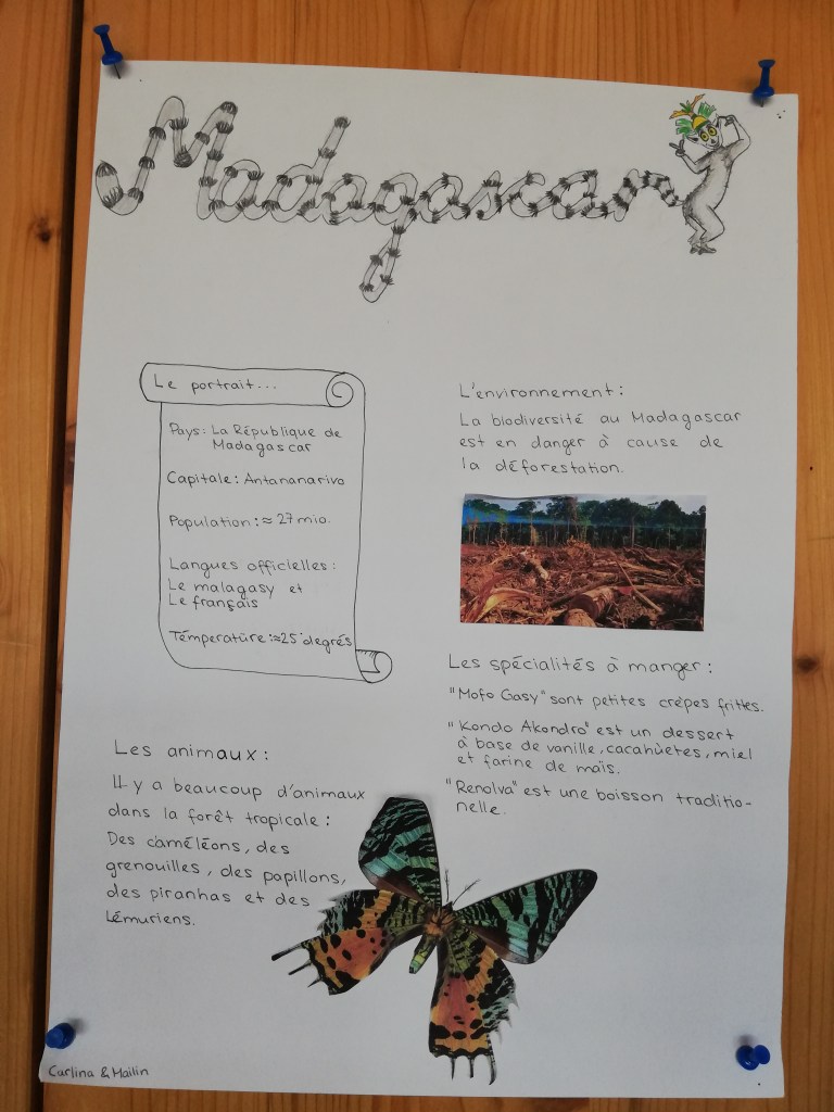 Die Klasse 4a hat sich während einer Doppellektion auf die Spuren der Francophonie begeben. Nach einer ausgiebigen Recherche sind tolle Lernposter entstanden. (A. Chaoui)